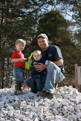 I've been at the house for the past few weekends with the boys. Heath has taken off a few days here and there to form porches and pour the concrete, so it's been fun to have the boys there to watch daddy "build dat new house," and they have both enjoyed playing with the sand, dirt, and gravel. Here are some pictures from two Saturdays ago (yes, I'm behind on posting pictures).